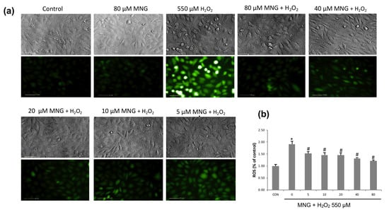 MNG reduced the intracellular ROS generation in EA.hy926 cells. (a) Representative images of ROS in EA.hy926 cells were detected by DCFH-DA using the Operetta high content image: vehicle-treated control cells; cells only treated with 80 µM MNG; cells were treated with 0, 5, 10, 20, 40 or 80 µM MNG for 24 h followed by exposure to 550 µM H2O2 for another 6 h (Scale bars represent 50 µm). (b) The levels of intracellular ROS were detected by DCFH-DA using a fluorescence microplate reader. EA.hy926 cells were pretreated with MNG for 24 h at the indicated doses (0, 5, 10, 20, 40 and 80 μM) before treatment with 550 μM H2O2 for 6 h and then incubated with 10 μM DCFH-DA for 30 min. * p < 0.05 vs. control group, # p < 0.05 vs. 550 µM H2O2 group. Data are the means ± SEM of 3 independent experiments.