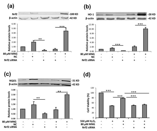 The silencing of Nrf2 using siRNA can markedly reduce the Nrf2 level and ARE-driven activity and has been used extensively to study the action mechanisms of Nrf2 activators [24]. To further verify the role of Nrf2 in regulating the expression of its target proteins by MNG, we evaluated the effect of Nrf2 siRNA on the MNG-mediated protective activity against oxidative damage in EA.hy926 cells (Figure 7). Nrf2 siRNA-treated groups showed lower levels of Nrf2 as compared to NC siRNA transfected and non-transfected control cells (Figure 7a). Then, Western blot was employed to further examine the impact of Nrf2 silencing on MNG-mediated induction of HO-1 and NQO1. As shown in Figure 7b,c, Nrf2 silencing significantly suppressed the MNG-induced upregulation of HO-1 and NQO1. An MTT assay revealed that the cytoprotective effects of MNG against the H2O2 insult were significantly reduced by siRNA-induced knockdown of Nrf2 (Figure 7d).