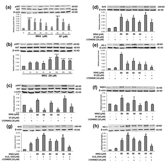 MNG stimulated Nrf2/HO-1 partially via the PI3K/Akt pathway in EA.hy 926 cells. (a) EA.hy926 cells were treated with 0–80 μM MNG for 24 h, and the protein levels of p-Akt were determined by using Western blot. (b) Cells were treated with 80 μM MNG for various time periods, and the protein levels of p-Akt were determined by using Western blot. (c–f). After preincubation with 10 μM LY294002 for 2 h, cells were cotreated with 40, 80 μM MNG and 20 μM SF for an additional 24 h, and the protein levels of p-Akt, Akt, Nrf2, HO-1 and NQO1 were then detected by using Western blot. * p < 0.05, ** p < 0.01, *** p < 0.001 vs. control group, Δ p < 0.05 vs. 40, 80 μM MNG or 20 μM SF. (g,h) After preincubation with 10 μM LY294002 and 40 or 80 μM MNG for 24 h, cells were cotreated with 550 µM H2O2 for an additional 6 h; the protein levels of Nrf2 and HO-1 were then detected by using Western blot. * p < 0.05 vs. control group, # p < 0.05 vs. 550 µM H2O2 group, Δ p < 0.05 vs. 40, 80 μM MNG + 550 µM H2O2 group. Data are the means ± SEM of 3 independent experiments.
