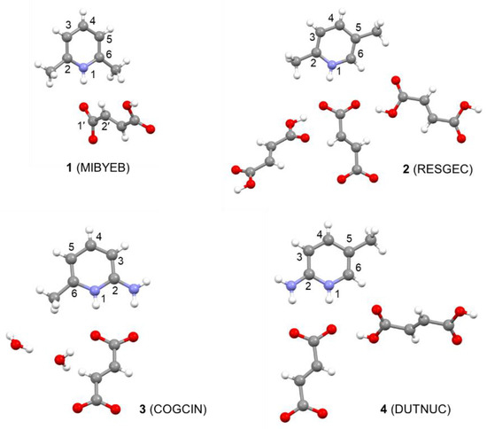The structures of the studied systems determined using X-ray diffraction (CSD ref codes MIBYEB, RESGEC, COGCIN and DUTNUC) were obtained from the Cambridge Crystallographic Database [30].