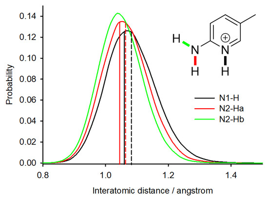 The probability distribution of N–H interatomic distances in system 4 (DUTNUC) obtained from the PIMD simulation. The solid lines indicate the N–H distance in the geometry-optimized structure and the dashed lines indicate the average N–H distance observed during the PIMD simulation.