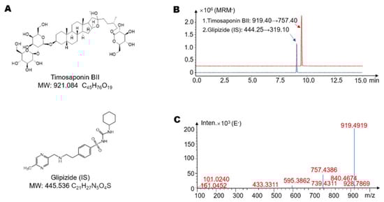 The structure and mass spectra of timosaponin BII. (A) The structural formula of timosaponin BII and the Glipizide (internal standard (IS)). (B) Extracted ion chromatogram (EIC) spectra of timosaponin BII and the internal standard (Glipizide). (C) The high-resolution mass spectra of timosaponin BII acquired by LC/MS-Q-TOF.