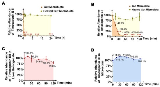 Timosaponin BII could be metabolized in the gut microbiota. Intestinal bacteria mainly participated in the metabolism of timosaponin BII by comparison between untreated and heated intestinal contents (A,B). (A) The level of timosaponin BII decreased during incubation with rat intestinal bacteria after 0 h, 1 h, 2 h, 6 h, 12 h, and 24 h. (B) The metabolic characteristic of timosaponin BII by gut microbiota in more precise spans of time. The liver may not be the metabolic site of timosaponin BII (C,D). (C) The metabolic curve of timosaponin BII by rat liver homogenate. (D) The metabolic curve of timosaponin BII by rat microsome. Data are presented as mean ± SD, and two-tailed Student’s t test were used for analysis (** p < 0.01, *** p < 0.001).
