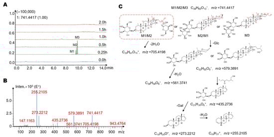 (A) The extracted ion chromatograms (EICs) showed that the levels of the possible metabolites M1–M3 increased with increasing time. (B) The MS/MS data of the timosaponin BII metabolites M1–M3. (C) Possible structures and mass spectrometric cleavage pathway of metabolites M1–M3. Among them, the structure framed by a rectangle was reported in the gut microbiota for the first time.