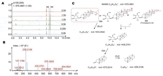 (A) The extracted ion chromatograms (EICs) showed that the levels of the possible metabolites M4 and M5 increased with increasing time. (B) The MS/MS data of the timosaponin BII metabolites M4 and M5. (C) Possible structures and mass spectrometric cleavage pathway of metabolites M4 and M5. Among them, the structure framed by a rectangle was reported in the gut microbiota for the first time.