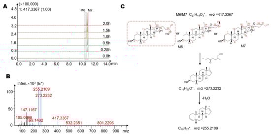 (A) The extracted ion chromatograms (EICs) showed that the levels of the possible metabolites M6 and M7 increased with increasing time. (B) The MS/MS data of the timosaponin BII metabolites M6 and M7. (C) Possible structures and mass spectrometric cleavage pathway of metabolites M6 and M7. Among them, the structure framed by a rectangle was reported in the gut microbiota for the first time.