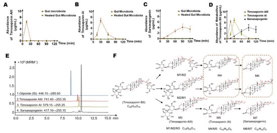 In the inactivated control group, none of the three metabolites were detected, indicating that the three substances were produced through metabolism by intestinal bacteria. Overall, we have summarized the possible pathways of timosaponin BII metabolism by gut microbiota, as shown in Figure 6F.