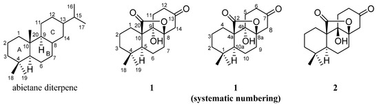 The structures of abietane diterpene and compounds 1 and 2.
