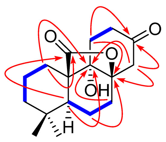 The presence of the HMBC correlations (Figure 2) from the proton signals at δH 1.41 (H-1), 2.29 (H-5), 1.64 (H-7), 2.34 and 3.00 (H-12), 2.80 (H-14) to C-9 (δC 76.2) determined a hydroxyl group at C-9. The ketone group belonging to C-13 (δC 207.4) was deduced from the observation of the HMBC correlations of H-11 (δH 2.01 and 2.20), H-12 (δH 2.34 and 3.00) and H-14 (δH 2.80 and 2.82) to C-13. In addition, besides the five degrees of unsaturations ascribed to two carbonyl groups and three six-membered rings, the remaining unsaturation required compound 1 to contain a cyclic ring system, which is assigned as a γ-lactone moiety formed at C-8 and C-10 positions due to the 13C-NMR [δC 87.9 (C-8), 76.2 (C-9), 53.6 (C-10) and 179.0 (C-20)] and the presence of the HMBC correlations of H-1 (δH 1.41 and 1.90) and H-5 to C-20 and H-6 [δH 1.75 (dd, J = 13.7, 4.7 Hz)], H-11 (δH 2.20) and H-14 (δH 2.80) to C-8.