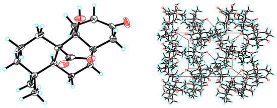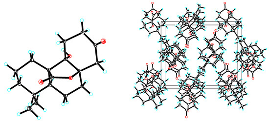 Compound 2 was obtained as colorless cubic crystals (MeOH) with the molecular formula determined as C17H24O4 through the analysis of its NMR and HRESIMS data [m/z 315.1564 [M + Na]+ (calculated as 315.1567)]. The IR spectrum of 2 displayed the absorptions of hydroxyl (3452 cm−1), carbonyl (1693 cm−1) and lactone (1719 cm−1) groups. The similarity of the NMR spectroscopic data and the same molecular formula of 2 to 1 suggested that the two compounds possessed the same planar structure. The significant differences of the 13C-NMR data at C-8 (δC 84.3), C-9 (δC 80.5) and C-11 (δC 24.4) indicated that 2 differs from 1 only by the stereochemistry at C-9, which was confirmed by the X-ray crystallographic analysis of a crystal obtained from the crystallization of 2 in MeOH (Figure 5).