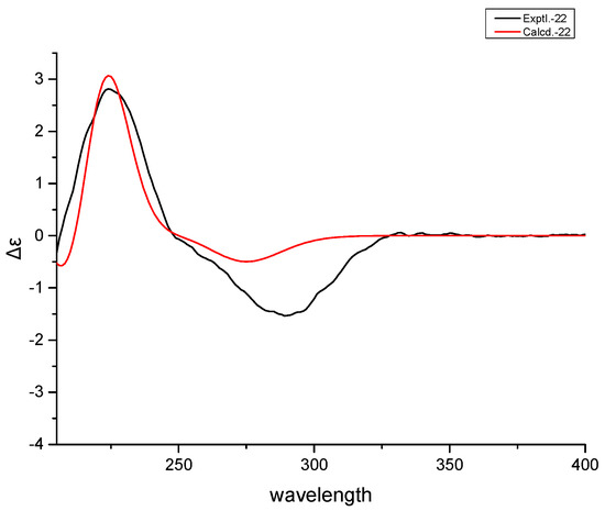 Experimental (black) and calculated ECD (red) spectra of 2.