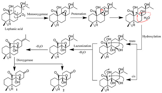 Rubesanolides F and G (1 and 2) are two unique lactone-type norditerpenoids that were determined to possess only 17 carbons in their degraded tricyclohexane abietane skeleton. They could be formed from lophanic acid through the plausible biogenetic pathway depicted in Scheme 1. Lophanic acid was found to be a major component (0.46%) in an Isodon species (I. lophanthoides) [11,12] and is therefore considered to be a plausible biosynthetic precursor of the two norditerpenoids. The monooxygenase enzyme converts the carbon–carbon double bond between C-8 and C-9 in lophanic acid to an epoxide, which can be converted to two trans-dihydroxyl groups and two cis-dihydroxyl groups through forming a carbon cation at C-9 as an intermediate. Lactonization of the hydroxyl group at C-8 with the C-20 carboxylic acid group yields the γ-lactone group formed between C-8 and C-20. Dehydration of the hydroxy group of C-13 produces the double bond between C-13 and C-15, which is cleaved by a dioxygenase enzyme to form the ketone group at C-13.