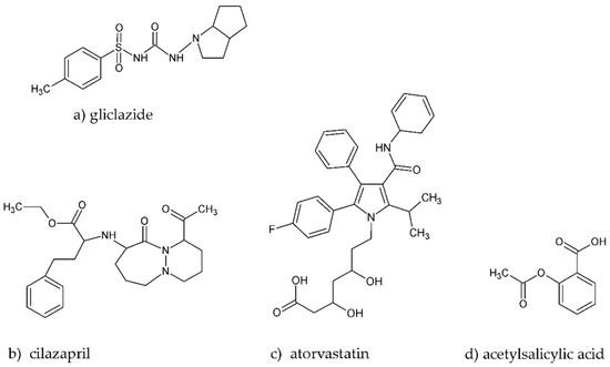 Chemical structures of gliclazide (a), cilazapril (b), atorvastatin (c) and acetylsalicylic acid (d).