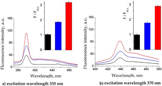 Emission spectra of nonglycated and differently glycated BSA at excitation wavelength 335 nm (a) and 370 nm (b). Relative increase in fluorescence intensity is shown in the inserts. Native BSA (black lines and bars), g10_BSA (blue lines and bars) and g30_BSA (red lines and bars) signify the use of 0, 10 and 30 mM glucose for glycation.
