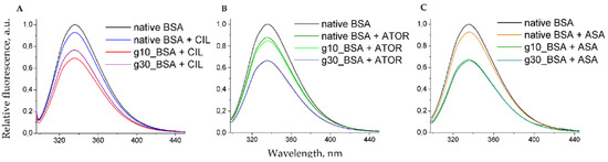 Fluorescence emission spectra of native BSA, g10_BSA and g30_BSA in the presence of cilazapril (A), atorvastatin (B) and acetylsalicylic acid (C) recorded at λex 295 nm.