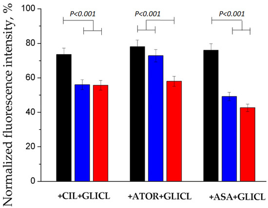 Changes in fluorescence intensity of BSA solutions (nonglycated and glycated at different degrees) after the addition of 14 μM gliclazide (molar ratio 1:7) in the presence of another drug observed at 295 nm excitation wavelength. Fluorescence is normalized to the value observed for the BSA-DRUG (cilazapril, atorvastatin or acetylsalicylic acid) complex and expressed as percentage. The colors of the bars refer to the following: native BSA—black, g10_BSA—blue, g30_BSA—red. Statistical significance was calculated using ANOVA, and P < 0.05 was considered significant.
