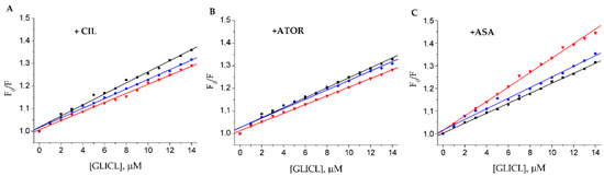 where F and F0 are the fluorescence intensity with and without the quencher (GLICL), respectively; kq is the quenching rate constant; τ0 is the average lifetime of a biomolecule without the quencher (τ0 = 10−8 s); KSV is the Stern-Volmer quenching constant (kq = KSV/τ0); Q is the concentration of the quencher [47,48,49].