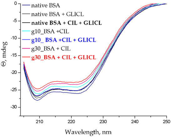 Circular dichroism spectra of protein (2 μM): native BSA, g10_BSA, g30_BSA with CIL (8 μM) and GLICL (14 μM), pH 7.4.