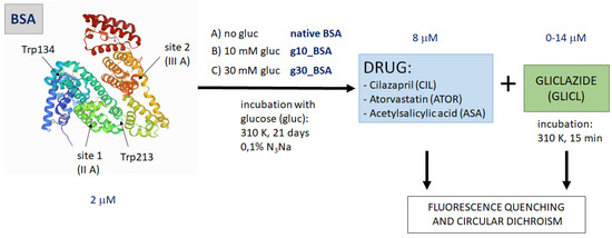 One mM stock solution of gliclazide and 0.4 mM stock solutions of cilazapril, atorvastatin, and acetylsalicylic acid were prepared in 5% methanol/PBS. Albumin solutions: BSA, g10_BSA, and g30_BSA were pre-incubated with CIL, ATOR, or ASA solution (final molar ratio DRUG to albumin 4:1), then GLICL was added to the mixtures in increasing concentrations (final molar ratio GLICL to albumin from 0:1 to 7:1) and incubated for 15 min in 310 K. The schematic workflow is presented in Scheme 1. Quenching experiments and CD measurements were repeated in triplicate.