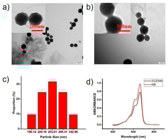 WP6–MB host–guest complexation was synthesized according to the published procedure [22,24,25], which was fully characterized by 1H NMR (Figures S1 and S2 in the Supporting Information). Cu/ZIF-8@ZIF-8 was first synthesized according to the published procedure [23,26]. The scanning electron microscopy (SEM) and transmission electron microscopy (TEM) showed that Cu/ZIF-8@ZIF-8 had typical hexagon morphology, with a diameter of approximately 190–290 nm (Figure 1a,b and Figure S4). In addition, TEM images showed that the obtaining Cu/ZIF-8@ZIF-8@WP6–MB had an obvious fuzzy edge compared with that of the obtaining Cu/ZIF-8@ZIF-8, which can be ascribed to the assembly of WP6–MB (Figure 1c). In order to further illustrate the homogeneity of ZIF materials in this design, we carried out an X-ray diffraction (Figure S4). The Cu/ZIF-8@ZIF-8@WP6–MB and MB UV-Vis spectra also demonstrated the WP6–MB capped Cu/ZIF-8@ZIF-8 through assembly (Figure 1d). In addition, the zeta potentials of OCZWM and ZIF were measured to prove the complexation of ZIF with WP6–MB (Figure S5). As the molar ratio of WP6 and MB is 1:1, and the mass ratio of WP6–MB and ZIF is 1:1, after calculation, it can be concluded that the loading rate of MB is 8.20% wt.