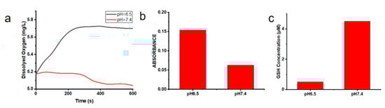 (a) the O2 content under the solution of OCZWM in pH = 6.5 and pH = 7.4. (b) The amount of ROS produced by OCZWM in pH = 6.5 and pH = 7.4. (c) The GSH content under the solution of OCZWM in pH = 6.5 and pH = 7.4.