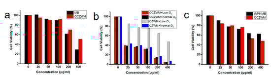 To gain further insight, the cell viability of OCZWM was carried out through MTT assay using HL7702 cells. As shown in Figure 4a, without light irradiation, OCZWM showed reduced dark toxicity compared to free MB with HL7702 cells. To provide further evidence of the anticancer attributes, the cell viability of OCZWM was carried out through MTT assay using HepG2 cells. Cu/ZIF-8@ZIF-8@WP6–MB were used as control groups. As shown in Figure 4b, under the condition of normal O2, the inhibition rates of OCZWM and Cu/ZIF-8@ZIF-8@WP6–MB on HepG2 cells were, in practical terms, the same. However, under the low O2 condition, the inhibitory rate of OCZWM on HepG2 cells did not significantly change, while the inhibitory rate of Cu/ZIF-8@ZIF-8@WP6–MB on HepG2 cells significantly decreased. This indicates that the OCZWM is released O2 in the tumor cells, improving the photodynamic therapy effect of MB. Moreover, it was found that, without light irradiation, the inhibition rates of OCZWM were higher than that of WP6–MB due to the CDT (Figure 4c).