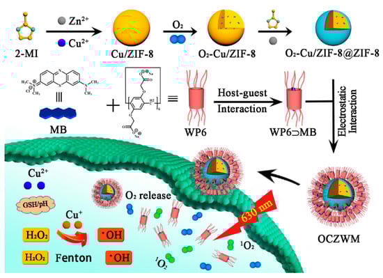 Consequently, the development of a new supramolecular PSs-MOFs carriers to maintain or even improve the efficiency of PDT can not only overcome the photobleaching and dark toxic effects of PSs, but also the combination therapy of PDT and CDT can be achieved. Zeolitic imidazolate frameworks-8 (ZIF-8) is an important class of MOFs, which has great potential in the construction of supramolecular drug delivery systems due to its stability in neutral, alkaline aqueous solutions and rapid decomposition in acidic solutions [15,16]. In addition, pillar[n]arenes, as a novel macrocyclic host molecule, can be used to construct nano-drug carriers through host-guest interaction [17,18], thus improving the solubility and stability of drugs [19,20,21]. Recently, based on the coordination between water-soluble carboxylated pillar[6]arene (WP6) and ZIF-8@DOX, we have developed a supramolecular targeted drug hybrid material with good dispersion efficiency, and host–guest complexation of WP6 and G as necessary modifiers to improve it0s water dispersion and give it target properties [22,23]. Herein, we design and synthesize Cu/ZIF-8@ZIF-8 nano carrier to adsorb O2 and participate in a Fenton reaction with Cu2+ achieving CDT therapy. Thereafter, a supramolecular photosensitive system was prepared based on Cu/ZIF-8@ZIF-8 nano carriers capped with the host–guest complexation WP6-methylene blue (WP6-MB), while the WP6-MB complexations can prolong the ROS production time of MB under light irradiation, overcome photobleaching, and can also realize CDT/PDT combination therapy (see Scheme 1).