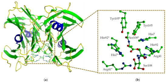 Interestingly, HIUHs from bacteria, fish and mammals were found to be highly similar to transthyretin (TTR) in the amino acid sequence. They were, therefore, designated as transthyretin-like proteins (TLPs) and have long been suspected to have a transport function. Later studies revealed that HIUH family is an enzyme progenitor of TTR, which losses enzyme function [7] but evolves to be a transport protein through mutation of critical residues for catalysis. The HIUH identified in Klebsiella pneumonia (kpHIUH) is a member of the TLPs. The X-ray structure of kpHIUH has been resolved recently, in which the kpHIUH protomer presents a β-sandwich structure which consists of nine β-strands and one α-helix (Figure 1a). In the crystal structure, four kpHIUH monomers of the enzyme form a homo-tetramer with 222 symmetry [1]. kpHIUH protomers assemble to dimer through interaction between the α-helices pairwise. Two dimers then form the tetramer with the extended β-sheets as the dimer–dimer interface. Two identical active sites of kpHIUH are formed at this β-sheet interface in the tetramer and situated near the surface of the proteins. In the active site of kpHIUH, the residues are arranged with a two-fold symmetry as shown in Figure S1 in the Supplement Material, which include the C-terminal tetrapeptide (Tyr105, Arg106, Gly107 and Ser108), two histidine (His7 and His92), a tyrosine (Tyr105) and an arginine (Arg41) from each of the two protein chains (Figure 1b).