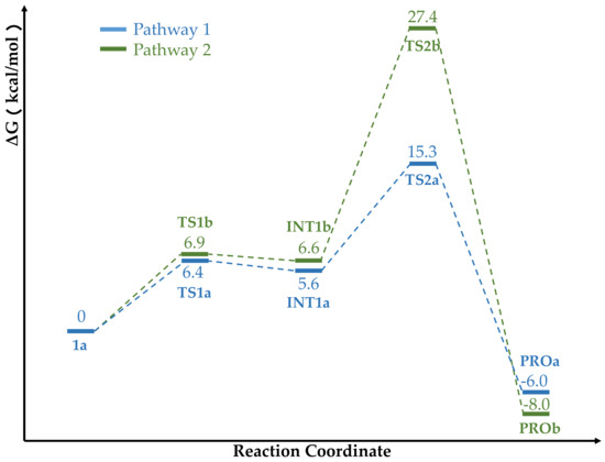 Free energy profile of the pathway 1 and pathway 2. The relative energies are labeled in kcal/mol.