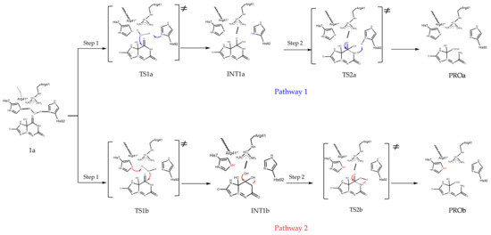 Starting from the reactant 1a, we explored two possible hydrolysis pathways of 5-HIU. The calculated energy profiles of the two pathways are shown in Figure 6. Both of the two pathways are rate-limited by the second step in which C6-N1 bond cleaves, while pathway 1 is kinetically 12.1 kcal/mol favorable than pathway 2 in this rate-limiting step. It is worth mentioning that the activation barrier of the rate-limiting step deduced from the experiment is 14.4 kcal mol−1 [1], which agrees well with 15.3 kcal mol-1 that is obtained for pathway 1 from our calculations.