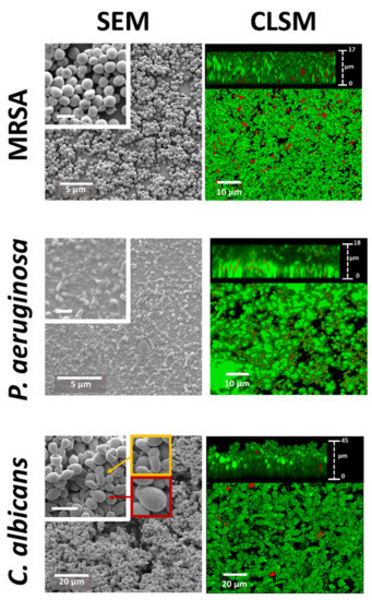 MRSA, P. aeruginosa and C. albicans were used to prepare biofilms on glass surfaces. These pathogens specifically cause a significant number of biofilm-associated infections on biomedical devices [34,35,36]. The biofilms were visualised using scanning electron microscopy (SEM) and confocal laser scanning microscopy (CLSM) imaging (Figure 1). The SEM images show that all three pathogenic microorganisms formed thick biofilms. Excess non-cellular biomass, presumably composed of EPS, was observed binding individual cells in the P. aeruginosa biofilm, while this non-cellular biomass was less prevalent in the MRSA biofilm. The biofilm of C. albicans was dominated by yeast cells, but it also contained some elongated cells that may have been emerging pseudohyphal cells. Different cell morphologies within C. albicans biofilms have been previously examined [37,38]. This biofilm morphology represents an early-intermediate phase of biofilm formation for C. albicans before significant EPS production [39,40].