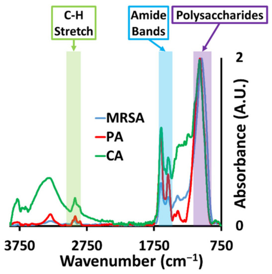 Average macro ATR-FTIR spectra for the three biofilms. MRSA, PA (P. aeruginosa) and CA (C. albicans). Regions characteristic of chemical species of interest are highlighted.