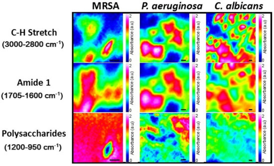 Synchrotron macro ATR-FTIR spectral maps of the biofilms formed by MRSA, P. aeruginosa and C. albicans. All scale bars are 2 µm.