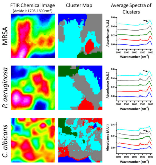The chemical properties of monoculture biofilms produced by methicillin-resistant Staphylococcus aureus (MRSA), Pseudomonas aeruginosa, and Candida albicans are investigated in this work. These pathogens were selected as representative of Gram-positive and Gram-negative cells, and yeast, respectively. They are all human pathogens that infect at a high rate through biofilms [34,35,36]. Synchrotron macro ATR-FTIR microspectroscopy at the Australian Synchrotron was utilized to obtain high-resolution spectral maps of the three pathogenic microbial biofilms. These maps were fully analyzed using chemometric approaches such as multivariate statistical methods. This study adds to our understanding of microbial biofilms and demonstrates the utility of synchrotron macro ATR-FTIR microspectroscopy for biofilm analysis.