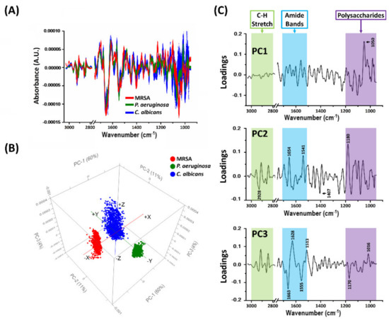 The PC loading plots are presented in Figure 5C. The loading plot of PC1 shows a notable peak in the polysaccharide region (1050 cm−1). This peak is likely to refer to ν(C–O) coupled with δ(C–O) of C–OH groups of carbohydrates [46,47,48], and is the major contributor towards the observed differences between species in the PCA score plot (Figure 5B). The wavenumbers where notable peaks and troughs occur in the PCA loading plots were assigned with their likely functional group, derived from a literature search, and are presented in Table S3.