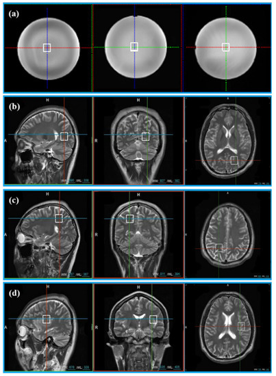The location of voxels acquired from phantom and 11 healthy volunteers. (a) Voxel location of the phantom; (b) voxel LA, (c) voxel LB, and (d) voxel LC are the voxel locations of 11 healthy subjects.