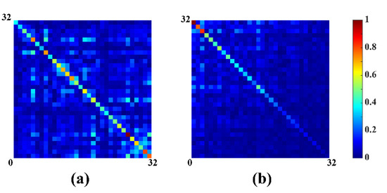 Noise correlation matrix of 32 coils before and after whitened. (a) Before whitened; (b) after whitened.