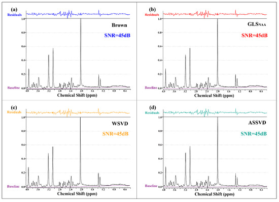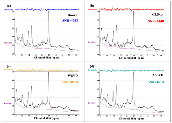 Phantom MRS coil-combined results. (a) Brown, (b) GLS using NAA peak as the reference, (c) WSVD, and (d) the proposed method ASSVD. The black and purple lines represent coil-combined MRS and the spectral baseline estimated by LCModel, respectively. Additionally, the fitting residuals shown at the top were calculated by .