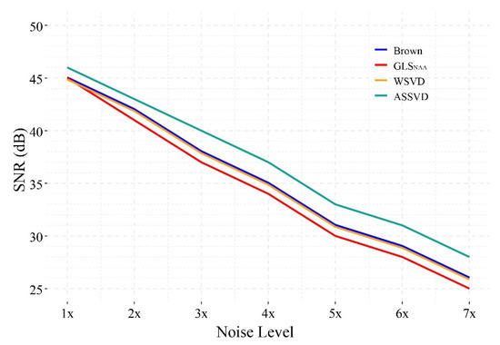 Figure 7 shows the SNR performance of different combination methods under 1×–7× noise levels. The result indicates that, under seven different noise levels, the proposed ASSVD always achieved the highest SNR among the four methods, while WSVD and Brown method always performed comparably, but slightly better than GLSNAA. In the case of low noise (1× noise), the combined spectra of the three compared methods had similar SNR. With the increase of the noise level, the gaps between ASSVD and the other three methods tended to expand, illustrating that the advantage of ASSVD can be more obvious under the strong noise. In summary, ASSVD showed superiority in the presence of various levels of noise in our test, implying its wide range of application scenarios.