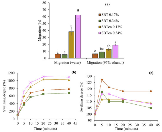 Migration percentage of antioxidant compounds into water and 95% ethanol, (a) Swelling degree in water (b) and Swelling degree in 95% ethanol (c) of starch films incorporating free or encapsulated SBT extracts at 0.17% or 0.34%. Different letters in each food simulant (a–c) indicated a statistically significant difference (p < 0.05).