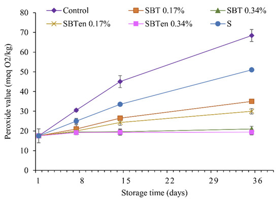 The PV of oil sealed with SBTen films was lower than that of oil sealed with SBT films, possibly because of its higher release of antioxidant compounds. However, the PV of oil samples sealed with either SBT or SBTen films at 0.34% were similar, possibly because the lower transparency of the SBT films at 0.34% would remove the initiators needed for oil oxidation.