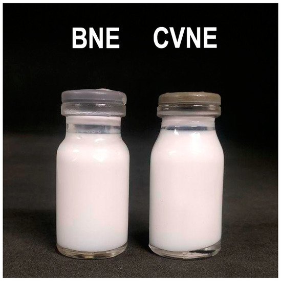 In this study, a CVNE and an unloaded nanoemulsion (blank formulation, BNE) were produced using ultrasonication. Previously, to assess the possible instability of nanoemulsions, the CVNE and the BNE were submitted to accelerated stability studies. Mechanical stress and thermal stability tests can predict important information regarding the stability of the formulation. When samples are subjected to increased temperature and centrifugation forces, the Brownian movements are increased, which allows the dispersed droplets to approach and increase the probability of collision [24]. Collision between these droplets can promote aggregation, increasing droplet size and coalescence rate. CVNE and BNE did not show alterations in the appearance (creaming or phase separation) after centrifugation or heating. Furthermore, even after 90 days of formulation, the nanoemulsions proved to be macroscopically stable and preserving the milky appearance without creaming of phase separation (Figure 1). The use of nonionic surfactants and the small size of the droplets may have favored short-range repulsive forces, such as steric overlap, hydration, and thermal fluctuation interactions [25], preventing destabilization.