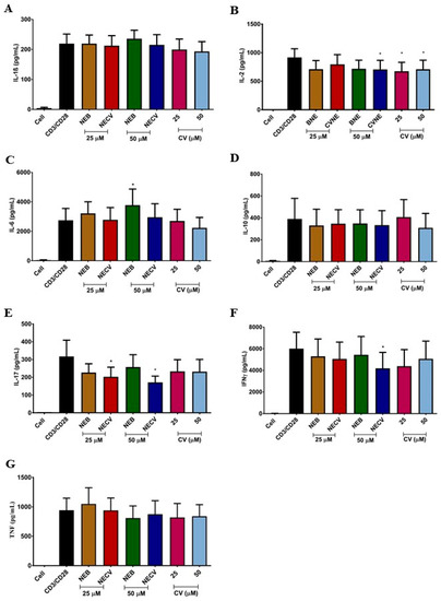 Immunomodulatory activity of carvacrol-loaded nanoemulsion (CVNE), blank nanoemulsion (BNE), and carvacrol (CV) in peripheral blood mononuclear cells. The bars represent cytokine levels: IL-1β (A); IL-2 (B); IL-6 (C); IL-10 (D); IL-17 (E); IFN-γ (F); and TNF-α (G) at 25 and 50 µM; non-stimulated (Cell); and stimulated cell (anti-CD3 and anti-CD28 antibodies) conditions. * p < 0.05 (Mean ± SEM, followed by Wilcoxon’s signed rank test).