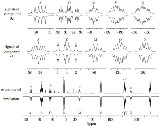 Experimental and simulated 31P{1H} NMR spectrum at 193 K of compounds 2a and 3a (∗ = 2a, # = 3a). The multiplet Q/V is the result of two overlapping multiplets from the two different spin systems.
