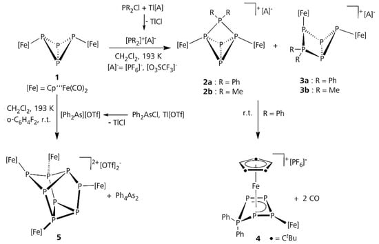 - Weigand, J.J.; Holthausen, M.; Fröhlich, R. Formation of [Ph2P5]+, [Ph4P6]2+, and [Ph6P7]3+ Cationic Clusters by Consecutive Insertions of [Ph2P]+ into P-P Bonds of the P4 Tetrahedron. Angew. Chem. Int. Ed. Engl. 2009, 48, 295–298. [Google Scholar] [CrossRef]