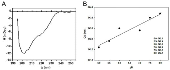 Circular dichroism analysis of the Lmr-47 (A) and intrinsic fluorescence spectra on varying pH (B). CD spectra of Lmr-47 at 1 mg/mL were recorded at pH 7.5 in 50 mM Tris–HCl at 25 °C. Experiments of IF were performed in 100 mM sodium citrate (pH 5.0 and 5.5), 100 mM phosphate buffer (pH 6.0 and 6.5), and 100 mM Tris–HCl (pH 7.0–8.0) with 0.2 mg/mL of Lmr-47 at 25 °C. Samples were excited at 280 nm, and fluorescence emission was measured between 300 and 400 nm.