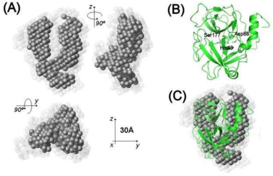 Molecular envelopes, tridimensional structure, and docking of Lmr-47. (A) Molecular envelope determined by SAXS at pH 8.0. Ab initio models represent an average of five dummy residue models (DRM) calculations using GASBOR [17]. The light gray spheres in (A) represent the space accessible for the DRM as judged by the degree of conservation of a given dummy residue among the five models. (B) The three-dimensional structure was obtained by comparative modeling. The structure is presented as a green ribbon, with its active site displayed as sticks (Asp88, His43, and Ser177). (C) Superposition of SAXS molecular envelope and the model built by comparative modeling. (C) Selected resulting structures of docking calculations with the 4-aminophenylguanidine complex, with the inhibitor colored in blue and the protease in green.