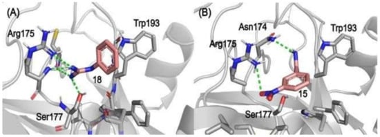 Docking results showed compounds 15 and 18 as the most potent inhibitor of the series (Figure 4). They showed hydrogen bond interaction to Cys173, Asn174, Arg175, and Ser177 and a pi–pi exchange to His43 and Trp193 (which composes a hydrophobic pocket wall). Both His43 and Ser177 are catalytic residues, which agree with the presumed active site. The expected repulsion between the inhibitors containing electron-withdrawing groups, as from compound 15, and the aspartic residue in the active site can be reflected as a weaker contact between the inhibitor and the catalytic triad (Asp88, His43, and Ser177) (Figure 4B).