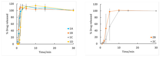 In all batches, after 10 min of dissolution, all the drug was released. Batches with a lower drug nanosuspension concentration (1A–D, 3A–C, and 4 A–C) reached 100% drug release already after 5 min. When 3D-printed (films 3A-C) and casted (films 4A–4C) films were compared, the casted films dissolved slightly faster, but the difference was not significant. Films with the highest nanosuspension concentrations (films 2B–2C) had slightly delayed drug release compared to those with lower drug amounts.