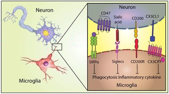 Other NIREGS such as CD47, CD200, and CX3CL1 are important in tissue resilience in neurons or through the interaction with co-receptors (SIRPα, CD200R, and CX3CR1) in microglia, modulating the phenotypes from resting to an activated state, among other functions [14]. Importantly, it was recently shown that the expression patterns of both CD47 and SIRPα, prevent excessive microglial phagocytosis and synaptic pruning in the dorsal lateral geniculate nucleus in mice [21]. In the following sections, the numerous roles of CD47 and its receptor SIRPα will be explored along with their signaling mechanisms.